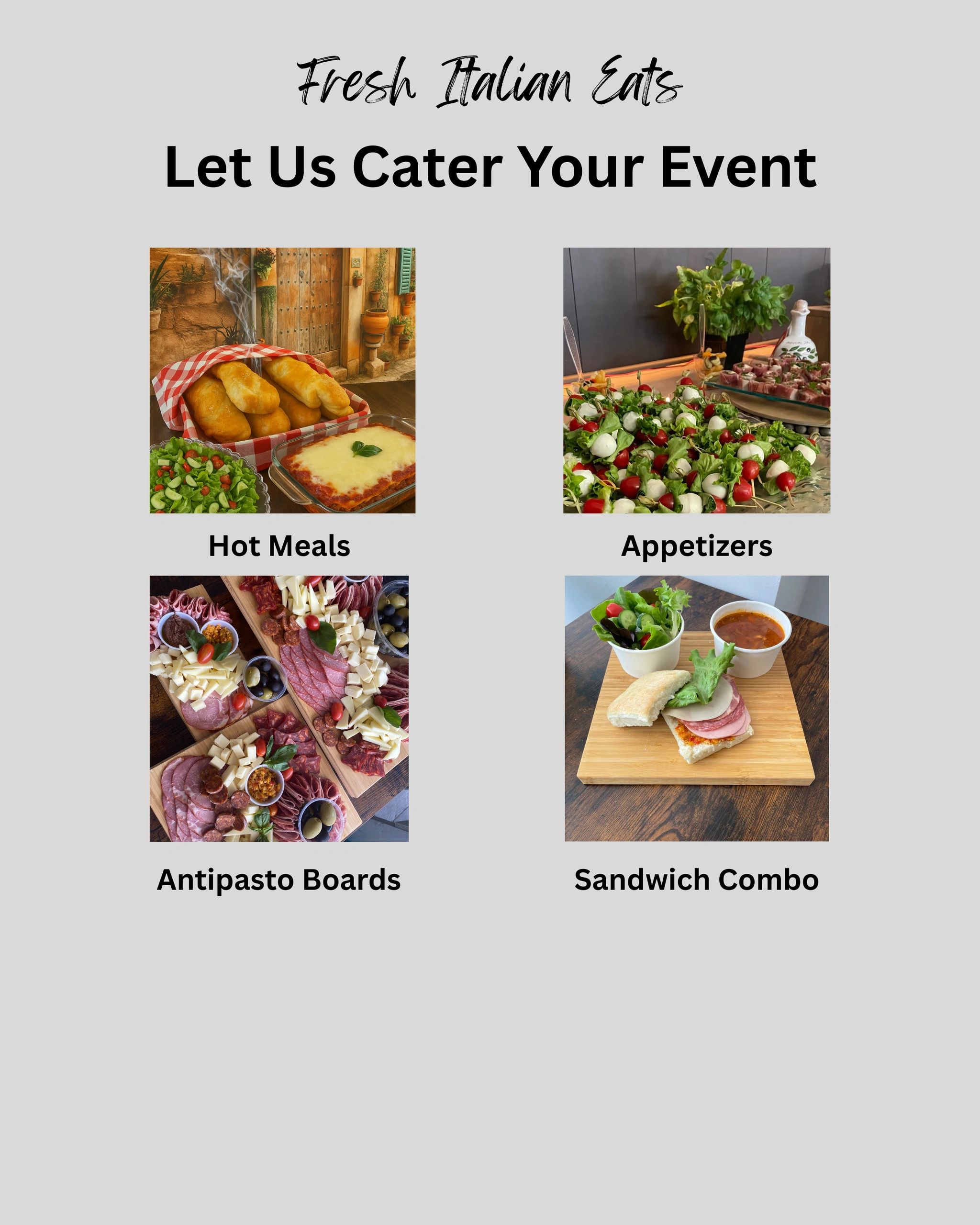 Looking for an Italian style menu... We got you covered. We offer hot and cold meals... antipasto platters... bite sized apps... let us know what you want and we will customize your needs.